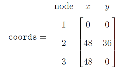 One final trick is that we can create arrays of classes. In the analysis of trusses, for example, we often loop over the elements in the structure and use an index to indicate the element under consideration. From the previous example, suppose we number AB as element 1 and BC as element 2. Joint A is node 1, joint B is node 2, and joint C is node 3. We will store coordinate information in a “coords” array.