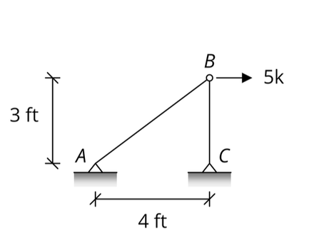 Once the class is defined, we then create instances of truss elements by calling on the class. Consider the truss in the figure below. Member AB has an area of 2.5 in.^2 and member BC has an area of 1 in.^2. Both members have Young’s modulus of 30,000 ksi. A force of 5 k is applied at joint B, and we might be interested in calculating the displacements at the nodes, the reaction forces at the supports, and the axial force in each member of the truss (we won’t do all that here, but we will set the problem up).