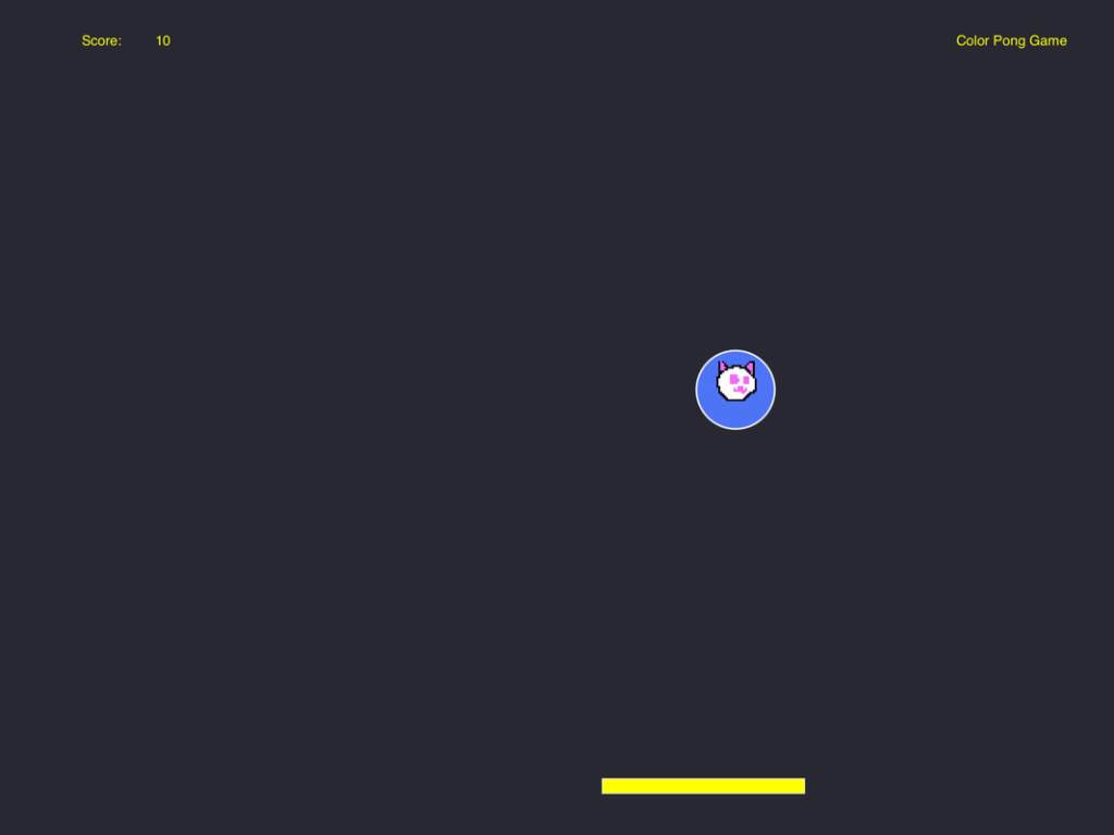 The idea of Color Pong is that the ball bounces off the left, top, and right sides of the screen, and the player controls a paddle at the bottom. The objective is to keep the ball from crossing the bottom edge of the screen (like the original Pong game). To add some flair to the game, I wanted the ball to change color everytime it hits a surface. I also threw in a sprite of a cat that my five year old helped draw.