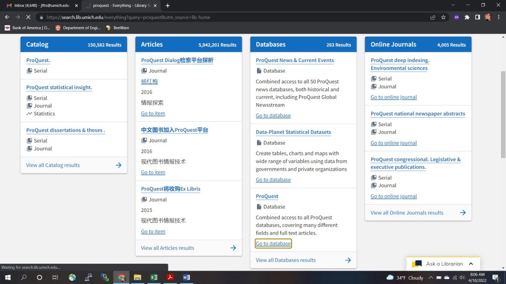 To access the ProQuest database, I go to lib.umich.edu and search “proquest.” ProQuest shows up under databases. I click the link to access ProQuest. I am prompted to enter my university credentials.