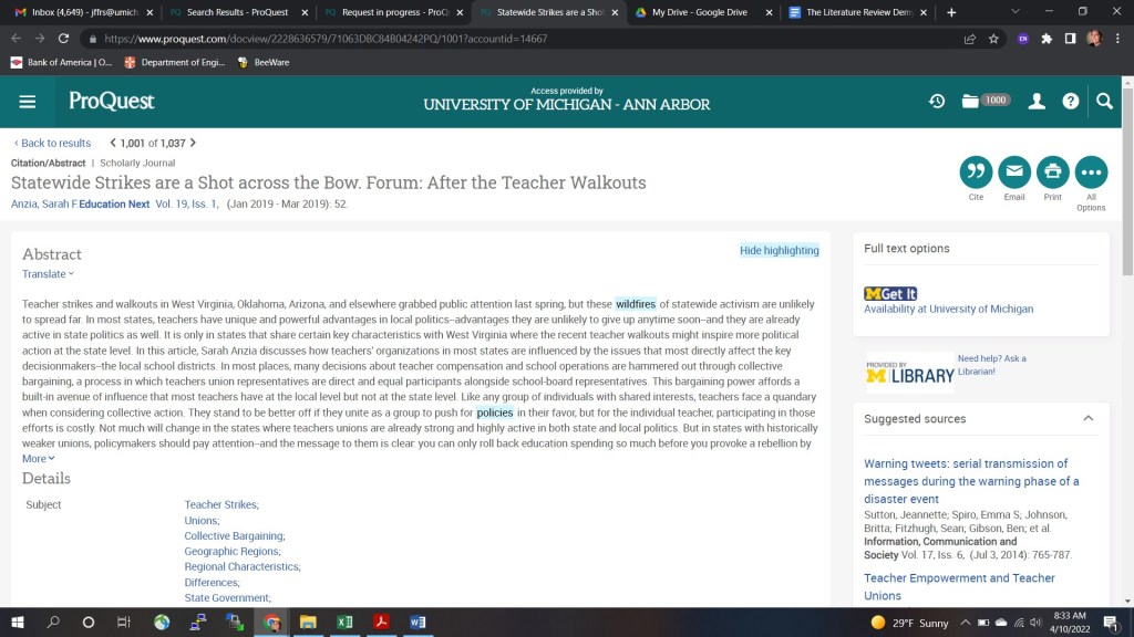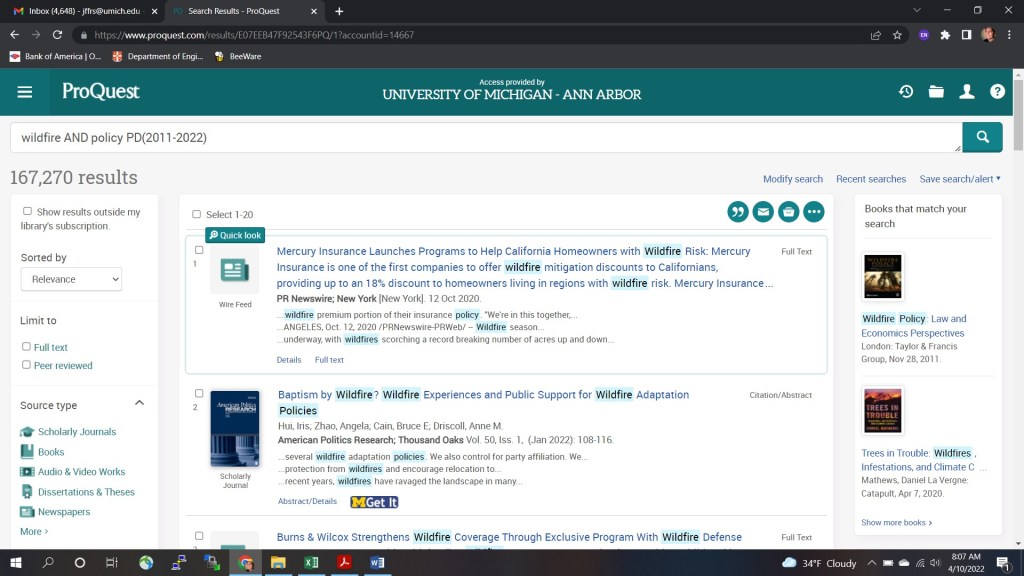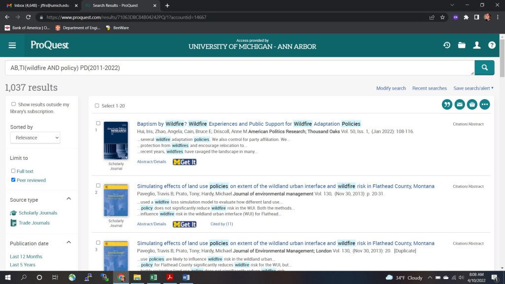 Note that our search isn’t necessarily done. We may need to consider alternative keywords. For our search on wildfire policy, we may need to also search for “wildland fire,” “forest fire,” “brush fire,” and “bushfire” to accurately capture the whole field. In addition, we can’t forget that there are other databases we may want to consider. In this case, we might want to consider a database like JSTOR that searches social science journals in addition to ProQuest.