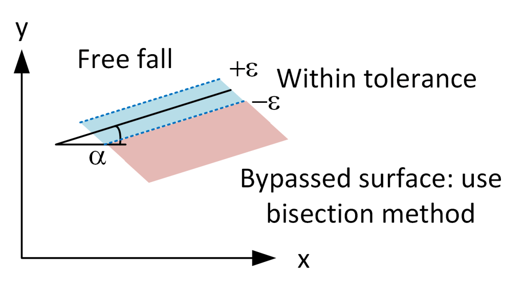 Since it is possible that the computed coordinates overshoot the boundary, the bisection method [1] is used to determine a precise time when the object is within to tolerance.