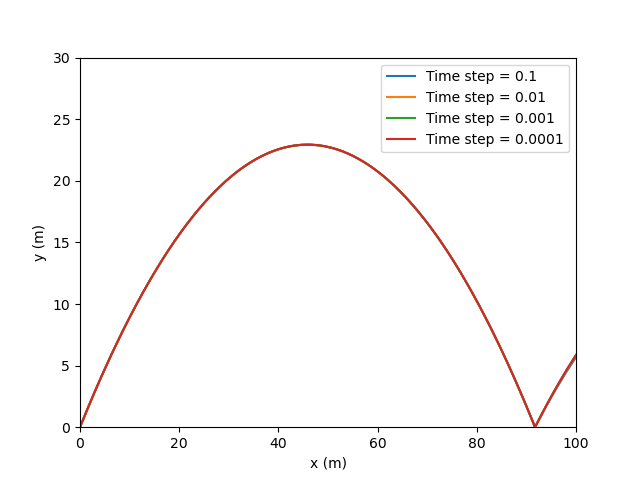 m. The error is negligible (i.e., less than the tolerance). Note that time step has little influence on the accuracy of the simulation up to the first impact. The figure below shows the trajectory for time steps ranging from 0.1 s to 0.0001 s, and there is virtually no difference in the computed solution. Furthermore, due to the use of the bisection algorithm, time step has no influence on the accuracy of
